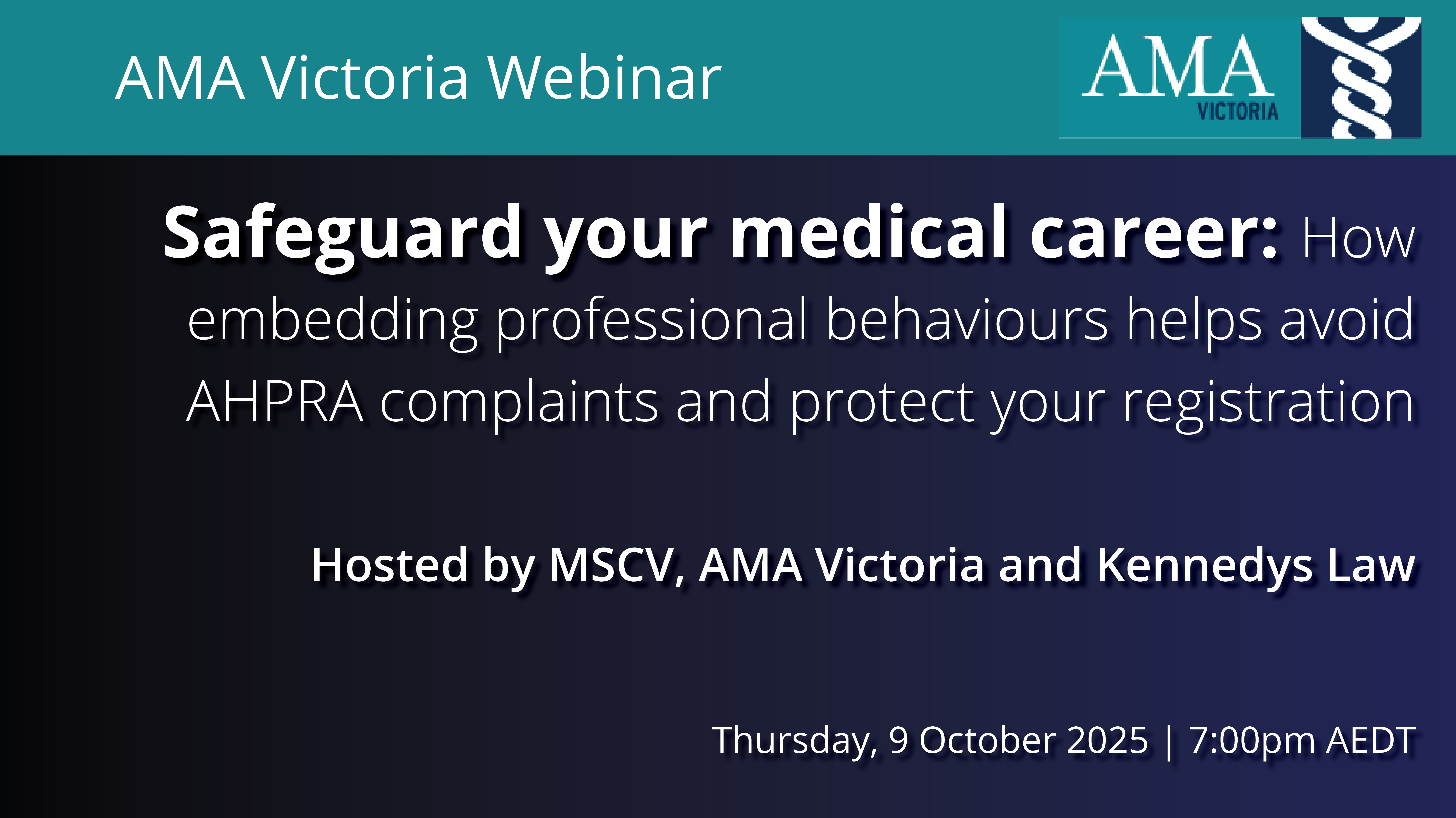 As you navigate your early career years in the medical profession, protecting your professional reputation and registration has never been more important. That’s why we’re inviting you to a free AMA member webinar hosted by AMA Victoria.